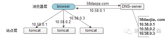 假设tomcat的吞吐量是1000次每秒,当系统总吞吐量达到3000时,如何扩容是首先要解决的问题,DNS轮询是一个很容易想到的方案。