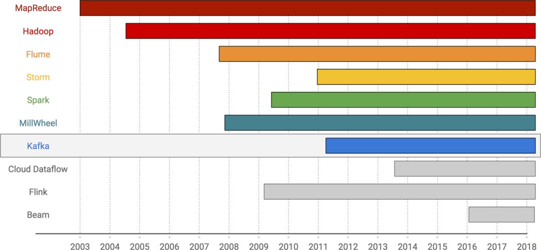 我们开始讨论 Kafka(图 10-23)。 Kafka 在本章讨论的系统中是独一无二的,因为它不是数据计算框架,而是数据传输和存储的工具。但是,毫无疑问,Kafka 在我们正在讨论的所有系统中扮演了推动流处理的最有影响力的角色之一。
