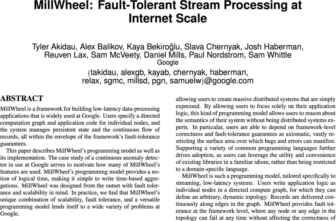 得益于客户的需求推动,MillWheel 最终成为能够支持无序数据的强大流处理引擎。因此,题为《MillWheel: Fault-Tolerant Stream Processing at Internet Scale》(图 10-22)的论文花费大部分时间来讨论在这样的系统中提供正确性的各种问题,一致性保证、Watermark。如果您对这个主题感兴趣,那值得花时间去读读这篇论文。