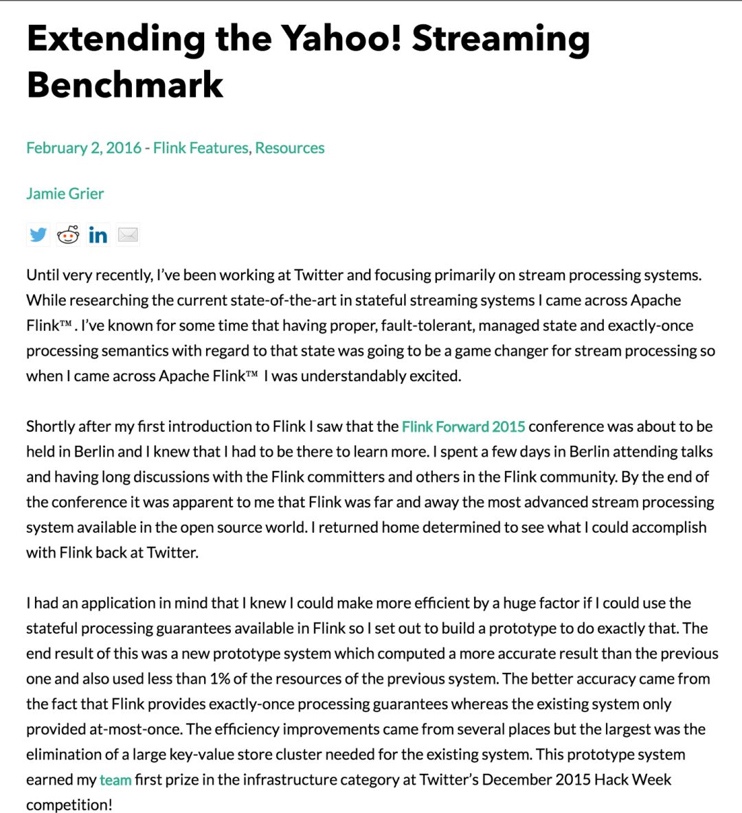 Flink 既能够支持精确一次的语义处理保证,同时又能够提供支持事件时间的处理能力,这让 Flink 获取的巨大的成功。接着, Jamie Grier 发表他的题为“《Extending the Yahoo! Streaming Benchmark》“(图 10-30)的文章,文章中描述了 Flink 性能具体的测试数据。在那篇文章中,杰米描述了两个令人印象深刻的特点: