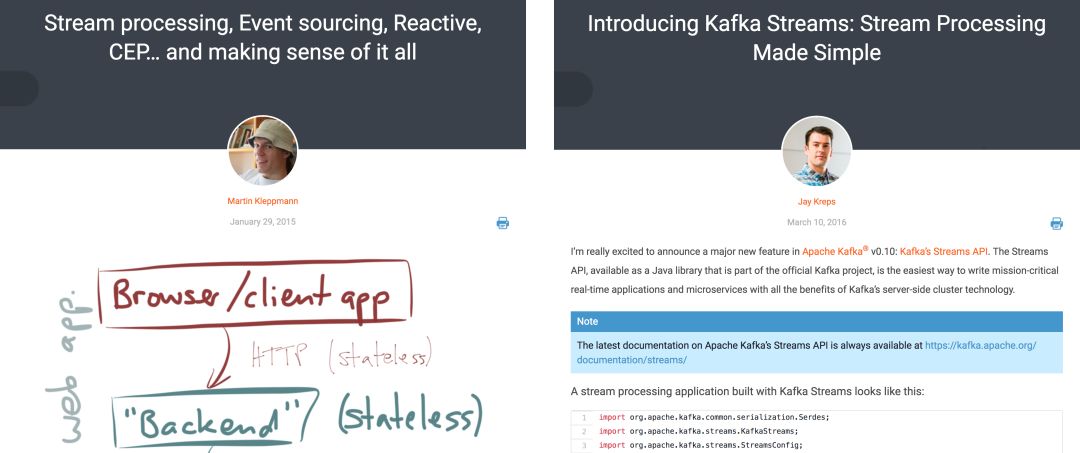 如果您想了解更多关于 Kafka 及其理论核心,JackKreps 的《I❤Logs》(O’Reilly; 图 10-24)是一个很好的学习资料。另外,正如第 6 章中引用的那样,Kreps 和 Martin Kleppmann 有两篇文章(图 10-25),我强烈建议您阅读一下关于流和表相关理论。