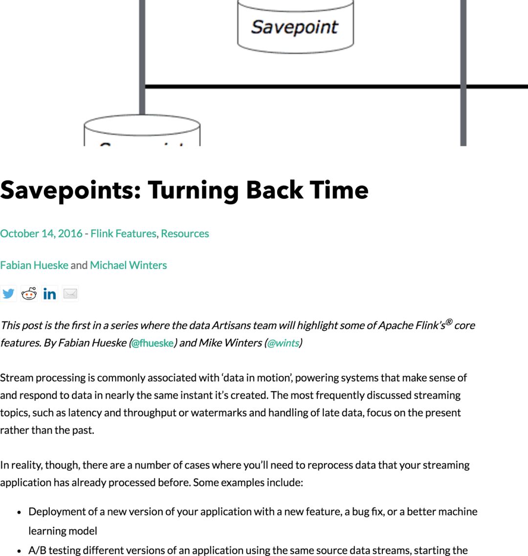 通过快照机制,Flink 获得了端到端数据一致性。Flink 更进了一步,利用其快照的全局特性,提供了从过去的任何一点重启整个管道的能力,这一功能称为 SavePoint(在 Fabian Hueske 和 Michael Winters 的帖子 [《Savepoints: Turning Back Time》(https://data-artisans.com/blog/turning-back-time-savepoints)] 中有所描述,[图 10-31])。Savepoints 功能参考了 Kafka 应用于流式传输层的持久化和可重放特性,并将其扩展应用到整个底层 Pipeline。流式处理仍然遗留大量开放性问题有待优化和提升,但 Flink 的 Savepoints 功能是朝着正确方向迈出的第一步,也是整个行业非常有特点的一步。 如果您有兴趣了解有关 Flink 快照和保存点的系统构造的更多信息,请参阅《State Management in Apache Flink》(图 10-32),论文详细讨论了相关的实现。