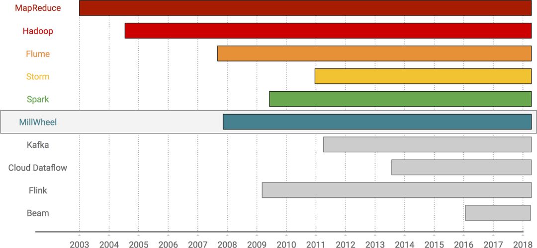MillWheel 是 Google 最早的通用流处理架构,该项目由 Paul Nordstrom 在 Google 西雅图办事处开业时发起。 MillWheel 在 Google 内的成功与长期以来一直致力于为无序数据提供低延迟,强一致的处理能力不无关系。在本书的讲解中,我们已经多次分别讨论了促使 MillWheel 成为一款成功产品的方方面面。
