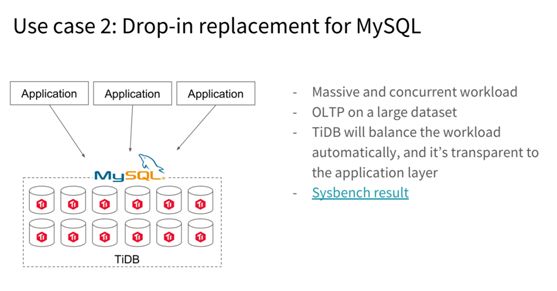 第一种场景就是 MySQL,比如已有的业务使用了 MySQL Sharding,没问题。现在 TiDB 因为在业务层实时兼容 MySQL 的这个访问协议。