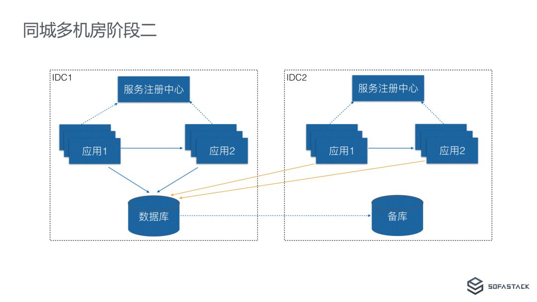 这一阶段,只是解决了机房容量不足的问题,两个机房逻辑上仍是一个整体。日常会存在两部分跨机房调用: