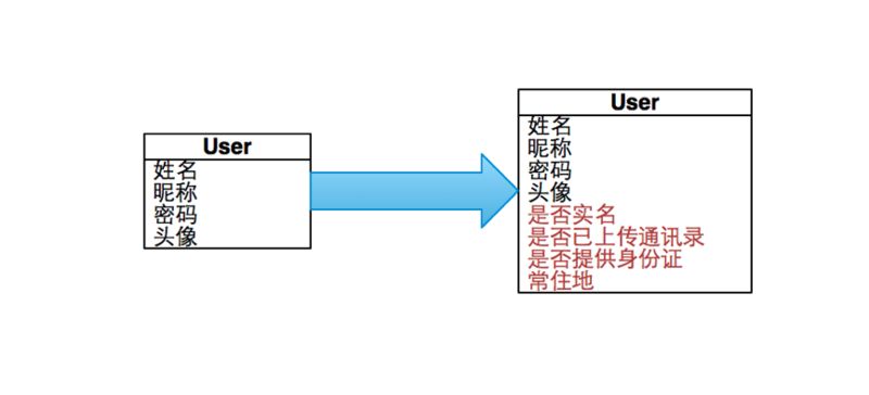 当然,我们说改造是要付出代价的。不仅之前的一个库中的表,要分成不同的库,各服务的程序要做不小的改造,其中最困难的是,同一张表的字段,可能会属于各个不同的应用。看下面这个 User 表。