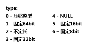 使用基本的 id + length + value 的方式可以实现非对称序列化,但是对所有的成员都需要写入 id 和 length 两个特殊的标识,增加了二进制数据的大小。而对于基本类型,其实长度是已知的。通过对数据类型按下面 type 进行划分:
