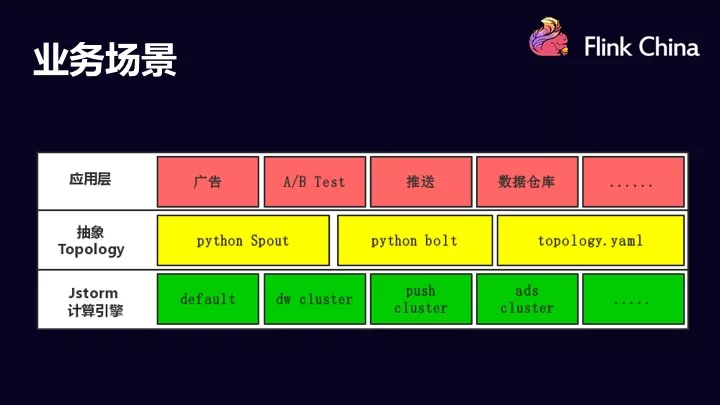 首先,应用层有广告,AB 测试,推送,数据仓库等业务;其次中间层针对 python 用户抽象出来一个模板,用户只需要在模板里写自己的业务代码,结合一个 yaml 配置将 spout, bolt 组成 DAG 图;最后将其跑在 Jstorm 计算引擎上。