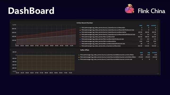 第一个是 Flink UI,也就是官方自带的 UI,用户可以去看。第二个是 Dashboard,展示作业 task qps 和 latency 以及 task 之间的网络 buffer,将这些重要信息汇总到一个页面,追查问题时清晰明了。