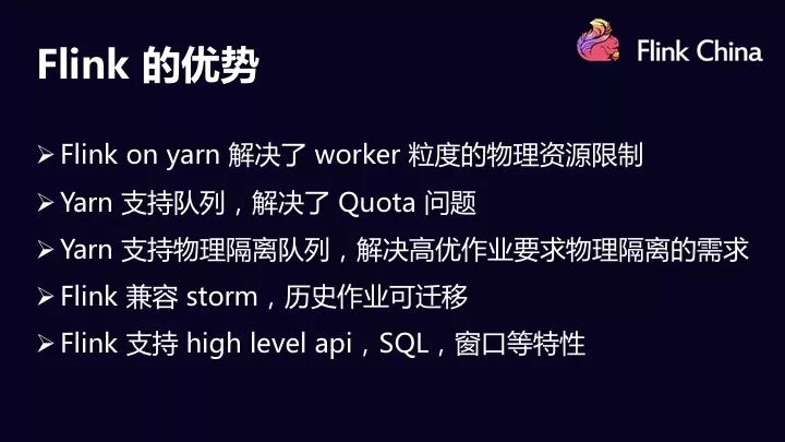 最终选择方案(2)也是考虑到 Apache Flink (以下简称 Flink)除了解决上述问题之外,能将运维工作交付给 yarn,节省人力;Flink 在 exactly once,time window,table/sql 等特性上支持更好;一些公司,例如阿里,在 Flink 上已经有了生产环境的实践; Flink 可以兼容 Jstorm,因此历史作业可以无缝迁移到新框架上,没有历史包袱,不需要维护两套系统。