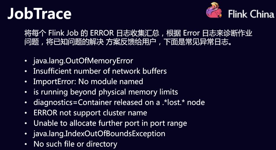 第四个是 Jobtrace 工具,就是把 Flink 框架层面产生的异常日志匹配出来,直接判断故障,告知用户处理方法。例如当作业 OOM 了,则告知用户如何扩大内存。